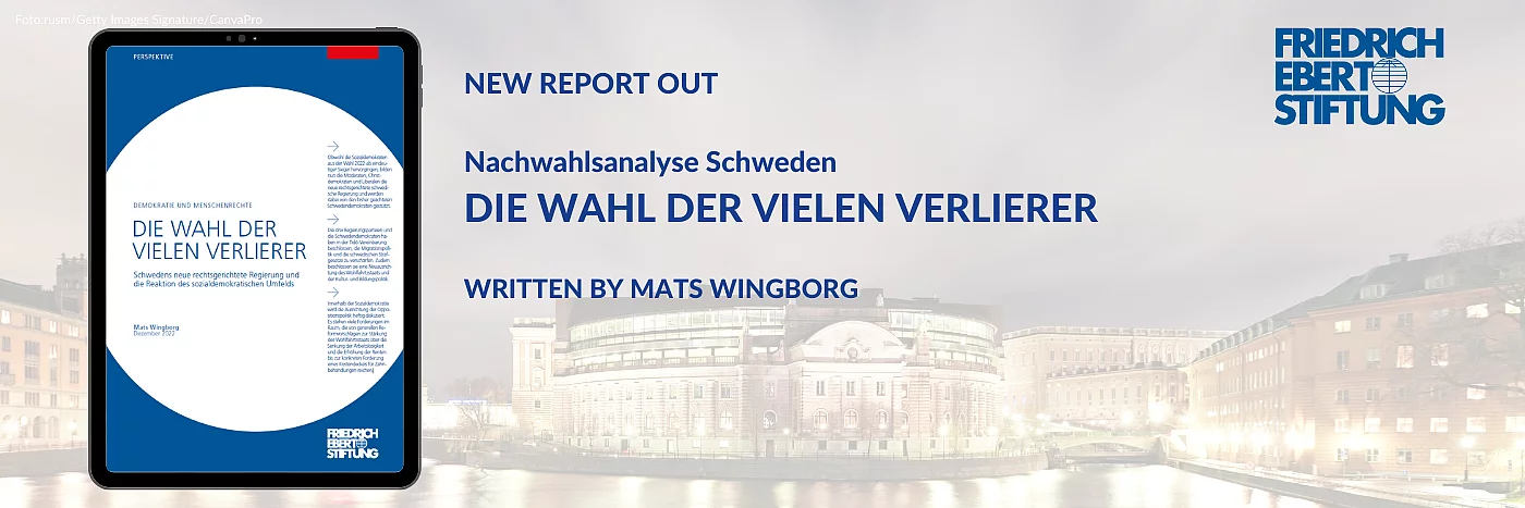 Publication Democracy and the Welfare State Die Wahl der vielen Verlierer Die Wahl der vielen Verlierer Wingborg, Mats New report in German about the Swedish elections 2022 out now. Wie konnte es passieren, dass die Sozialdemokraten trotz eines Zugewinns an Stimmen die Wahl verloren? Was für Faktoren haben die Wahlergebnisse beeinflusst? Und wie ist es möglich, dass drei Parteien, die zusammen weniger Stimmen haben als die Sozialdemokratische Partei, nun die Regierung stellen? In unserer neuen Publikation analysiert Mats Wingborg die Umstände und Folgen der Wahl vom 11. September 2022. Schwedens neue rechtsgerichtete Regierung und die Reaktion des sozialdemokratischen Umfelds Obwohl die Sozialdemokraten aus der Wahl 2022 als eindeutiger Sieger hervorgingen bilden nun die Moderaten, Christdemokraten und Liberalen die neue rechtsgerichtete schwedische Regierung und werden dabei von den bisher geächteten Schwedendemokraten gestützt. In diesem Report werden die Gründe für das Scheitern der Sozialdemokraten bei der Wahl 2022 sowie die Rolle der Schwedendemokraten bei der Regierungsbildung näher beleuchtet. Die Ergebnisse der Wahl erscheinen paradox. Obwohl die Sozialdemokratische Partei einen Zuwachs von zwei Prozent bei der Reichstagswahl verzeichnen konnte und in mehreren wichtigen Städten und Gemeinden nun wieder die Regierung stellt, mussten sie sich im Reichstag dem liberal-konservativen Block geschlagen geben. Die Regierungsbildung gelang diesem nur durch die Unterstützung der rechtsradikalen Schwedendemokraten. Diese Zusammenarbeit ist im sogenannten Tidö-Abkommen festgehalten und stellt die Grundlage der gemeinsamen Politik dar, die durch einen klaren Fokus auf strengere Migrationspolitik, schärfere Strafgesetze, und eine Neuausrichtung der Wohlfahrts- und Kulturpolitik gekennzeichnet ist. Die Kritik an dieser Politikausrichtung wird auch die Oppositionszeit der Sozialdemokraten prägen. Lies den neuen Bericht hier: Die Wahl der vielen Verlierer - Schwedens neue rechtsgerichtete Regierung und die Reaktion des sozialdemokratischen Umfelds Kontakt: Josefin Fürst